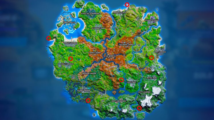 One is on a small sandy island northeast of Craggy Cliffs. The next is just west of Fort Crumpet, somewhat hidden behind a bush near a cliff on the west coastline of the island. You can find another spooky TV set in a small grove northeast of Holly Hedges. Travel southeast of Slurpy Swamp, and you’ll find a TV set tucked away roughly halfway between Slurpy Swamp and the the Flush Factory. The next is at a campsite on a cliff just north of the island named Camp Cod.